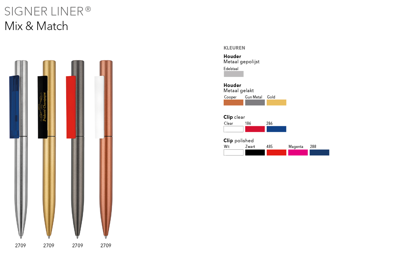 Alle met het Mix & Match logo gemarkeerde balpennen kunnen in kleur en oppervlak worden samengesteld.