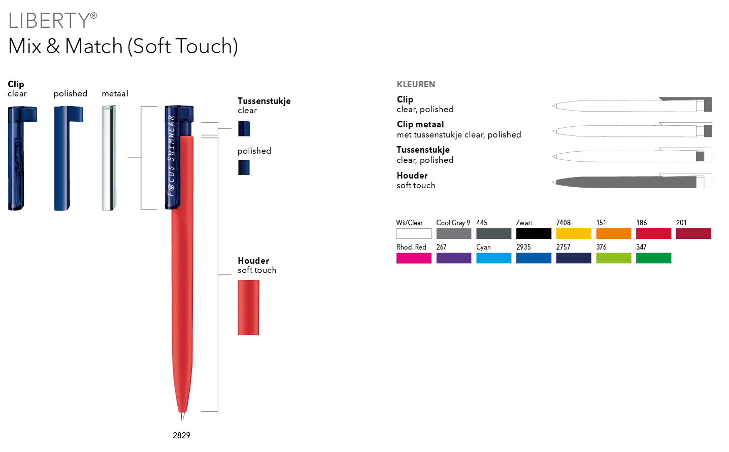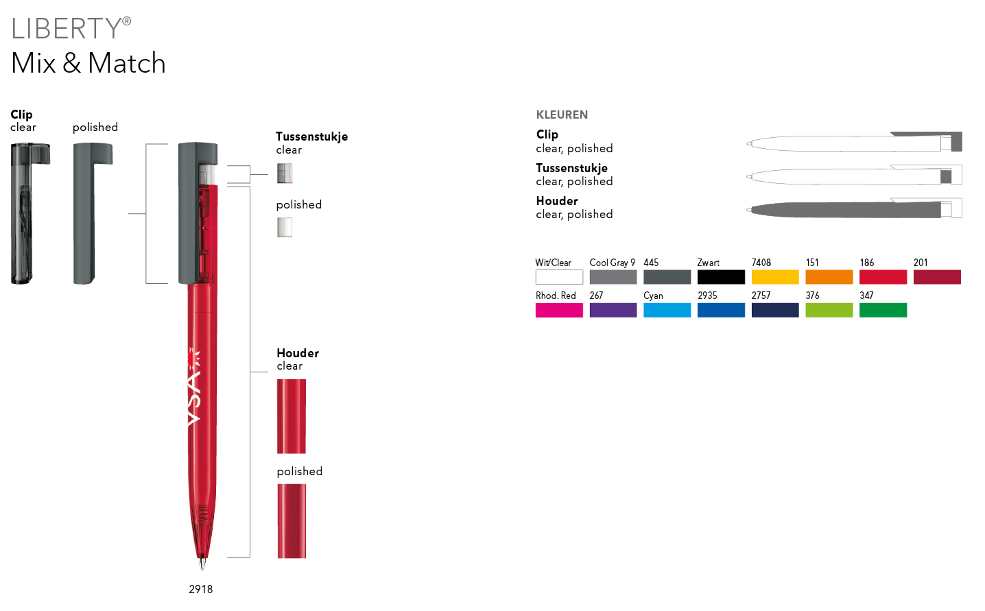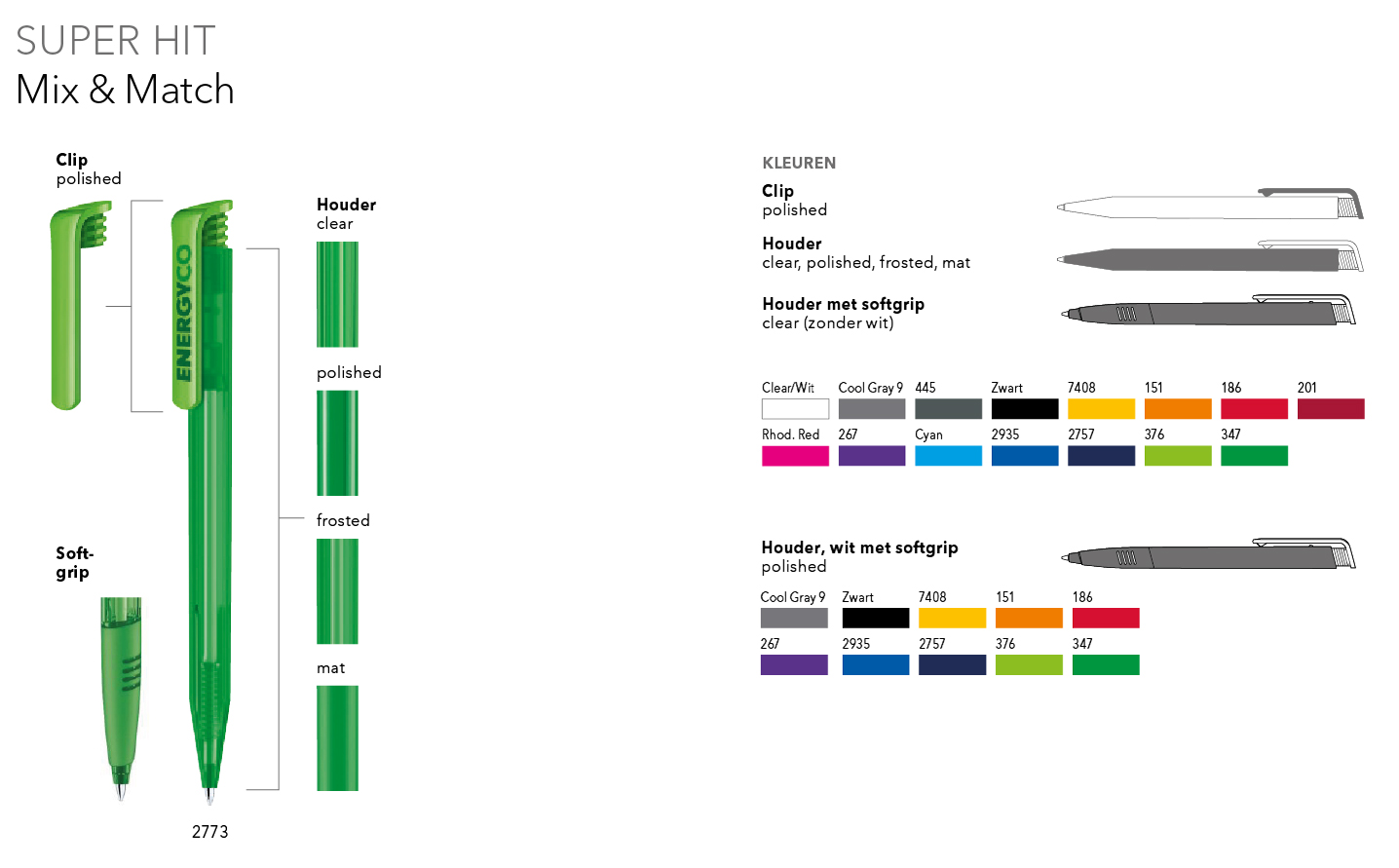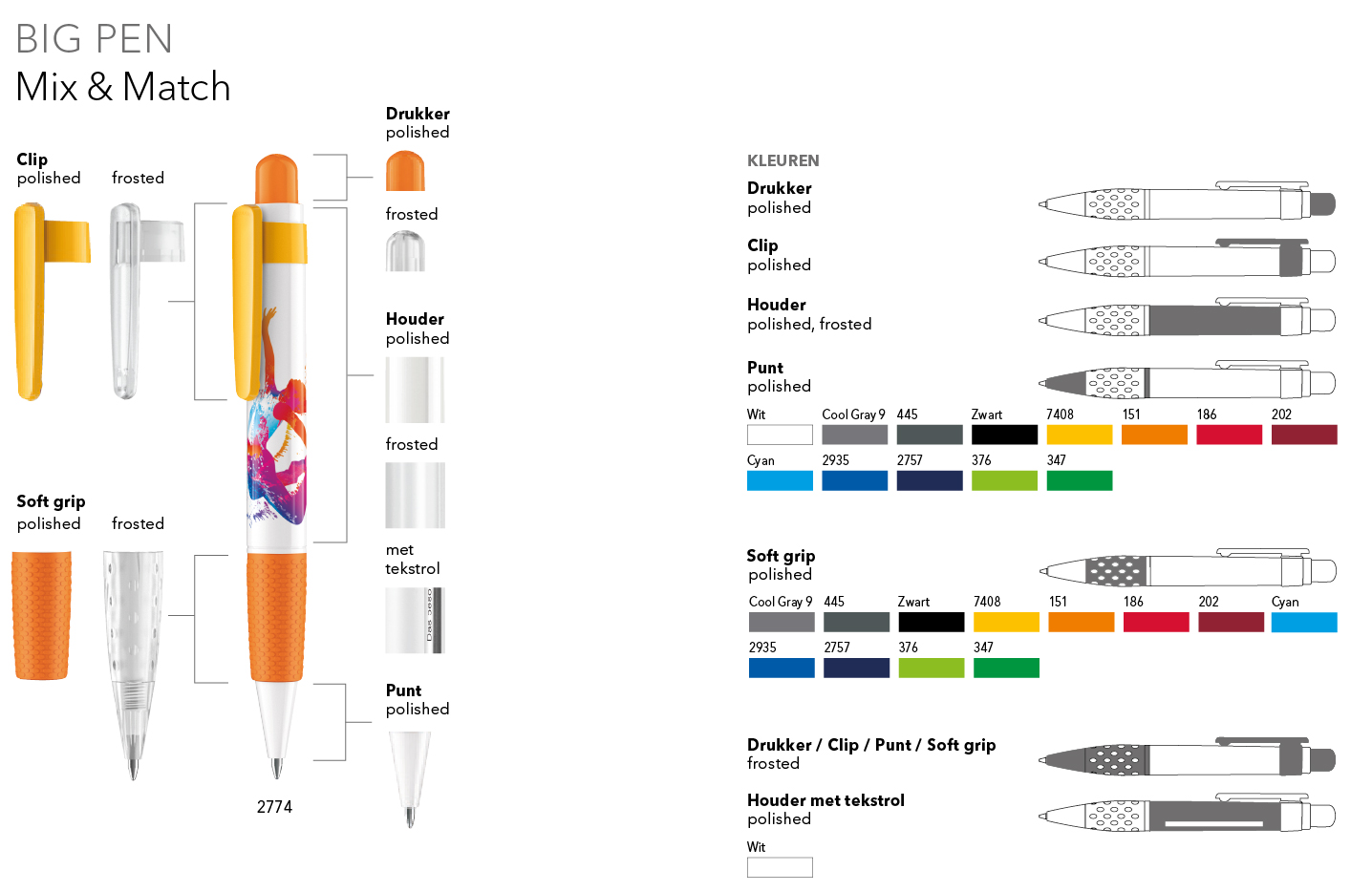Neem contact met ons op en wij adviseren u graag bij de keuze voor de gewenste Mix & Match uitvoering. Ook kunnen wij een visualisatie voor u realiseren om een nog betere indruk van de samengestelde balpen te geven.
